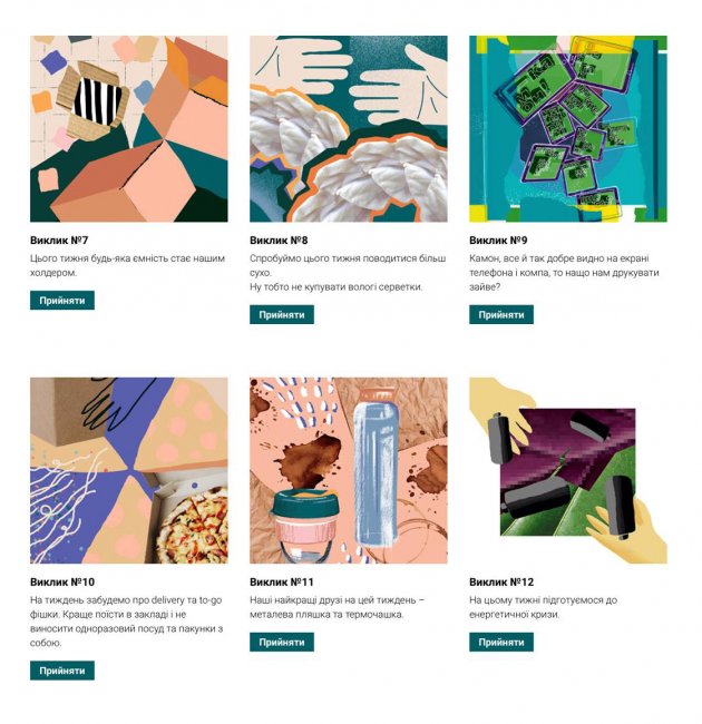 Наприклад, протягом семи днів ходити в магазин з тканинною сумкою замість того, щоб брати пластикові пакети, відмовитися від купівлі вологих серветок, користуватися термочашкою, посадити на підвіконні цибулю або не пити пакетовані чай і каву. Крім того, розробники обіцяють додати ще більше щоденних викликів.