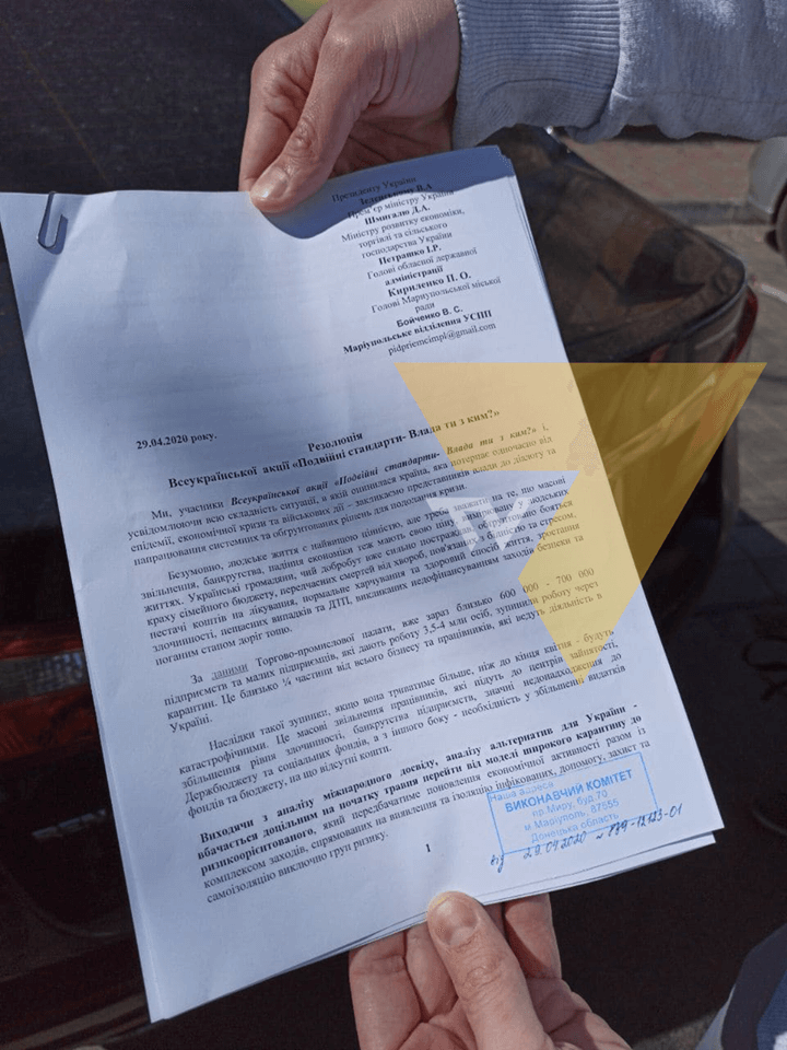У Маріуполі автоколона з підприємцями середнього та малого бізнесу приїхала до будівлі міськради та висловила свою резолюцію чиновникам. Вони вимагали послаблення карантину для підприємців, аби ті мали можливість працювати. Про це повідомили кореспонденти з місця події.