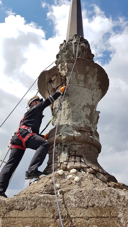 В Маріуполі руйнується верхівка правого будинку зі шпилем. Його облицювання зносилися, і аби попередити нещасні випадки, довелося викликати на місце рятувальну службу міськради.