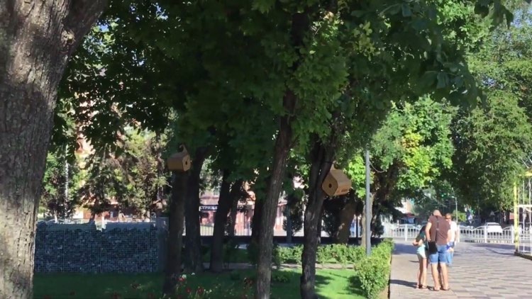 В центрі Маріуполя біля драматичного театру з'явились будиночки для білок. Така інформація з'явилася в одному з місцевих Telegram-каналів.