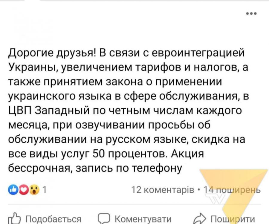 Нещодавно, у Facebook поширився допис ветеринара однієї із клінік для тварин у Центральному районі. У ньому було вказано, що клієнтів обслуговуватимуть російською мовою по парних днях та ще й знижку зроблять.
