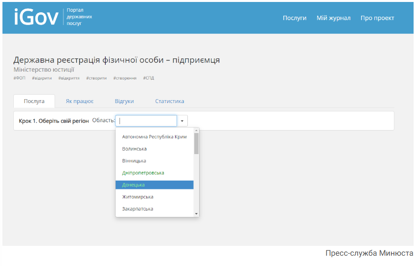 вибрати "Послуги бізнесу", і в підрозділі "Реєстраційні дані" — пункт "Державна реєстрація фізичної особи-підприємця" (функція доступна в Дніпропетровській, Тернопільській та Донецькій областях).