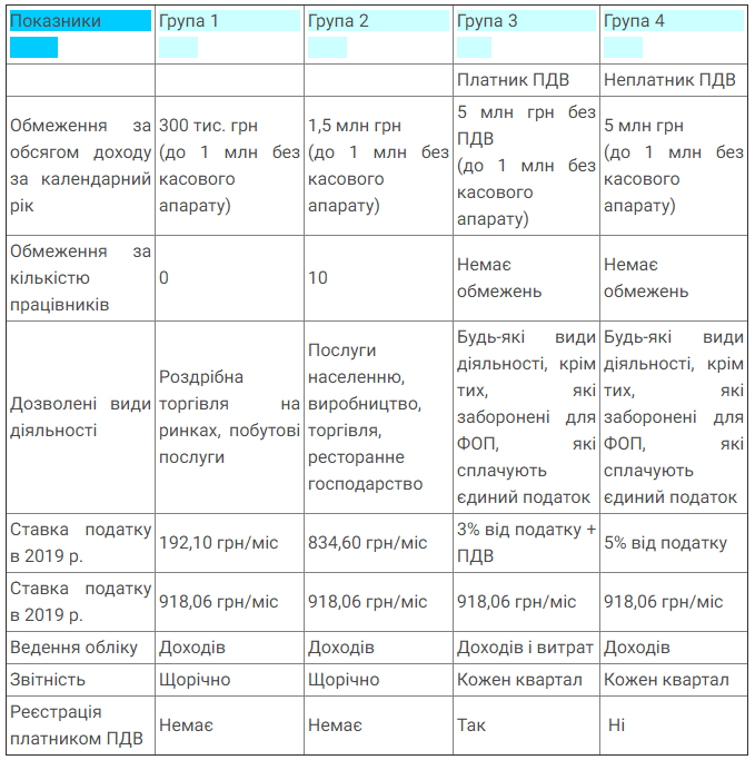 Приватні підприємці діляться на чотири групи. Основні відмінності між групами підприємців наведемо в таблиці нижче.