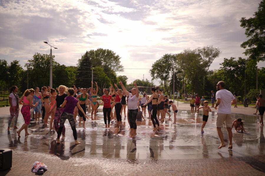 На знімках йоги намагаються утриматись на одній нозі, медитувати та правильно дихати.Під кінець фестивалю усі учасники, насолодились прохолодою у фонтані, танцювали та сміялися.