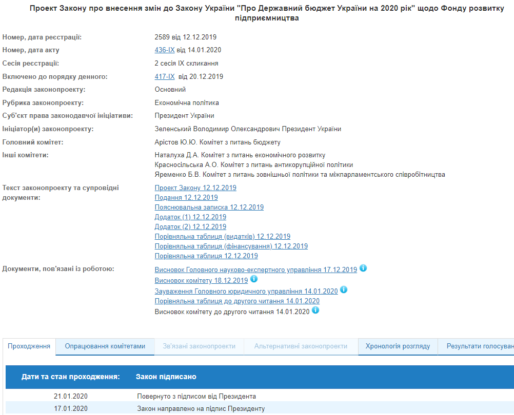 Останній етап проходження відповідного проекту закону №2589 "Про внесення змін до закону "Про державний бюджет України на 2020 рік" про Фонд розвитку підприємництва" - повернуто з підписом від президента.