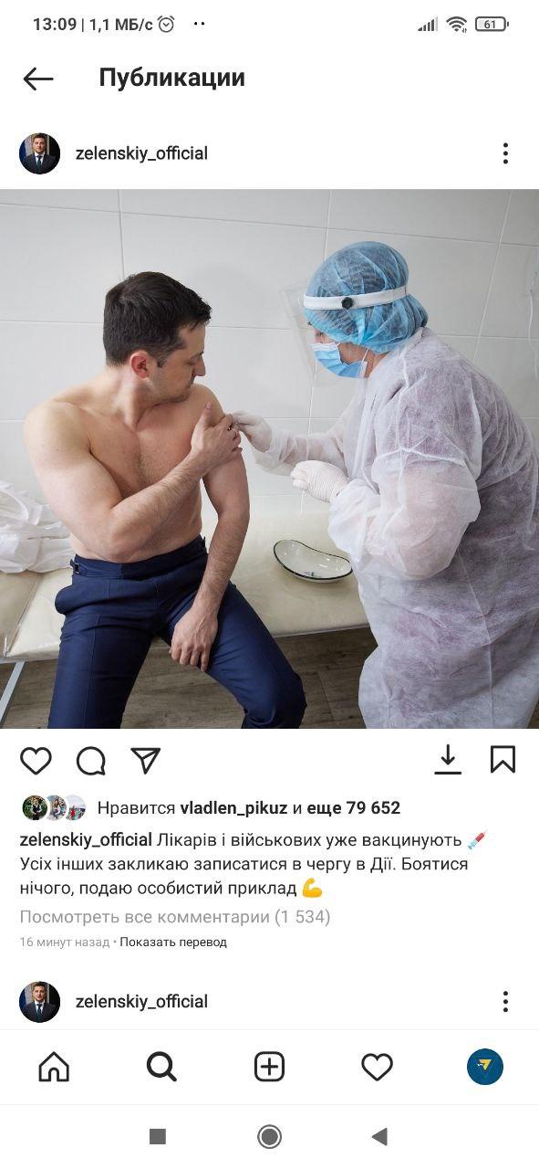 "Лікарів і військових уже вакцинують. Усіх інших закликаю записатися в чергу в "Дії". Боятися нічого, подаю особистий приклад", - написав Володимир Зеленський.