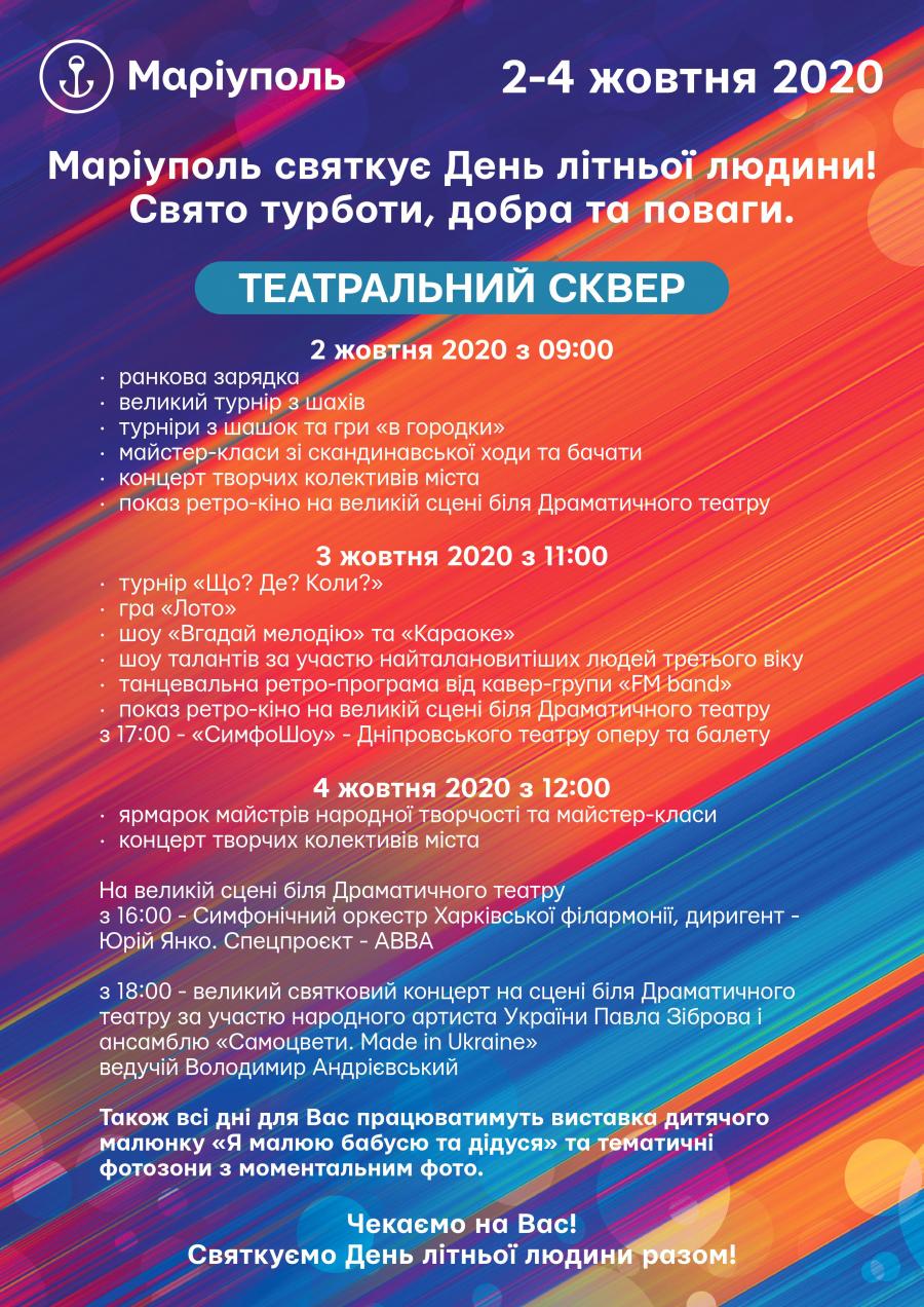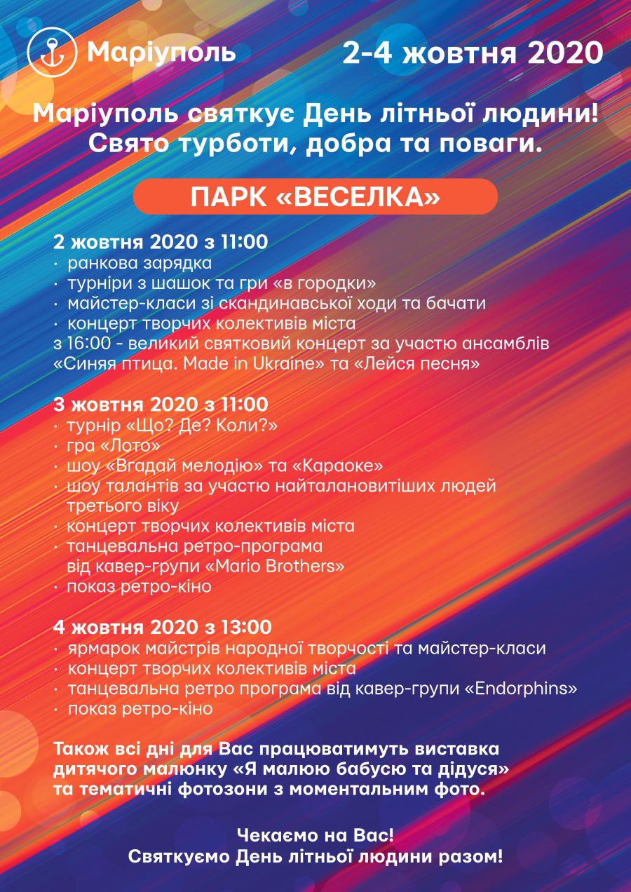 Згідно з оновленим розкладом програми в Театральному сквері та парку "Веселка" маріупольців похилого віку чекають майстер-класи, виставки дитячих малюнків та концертна програма.