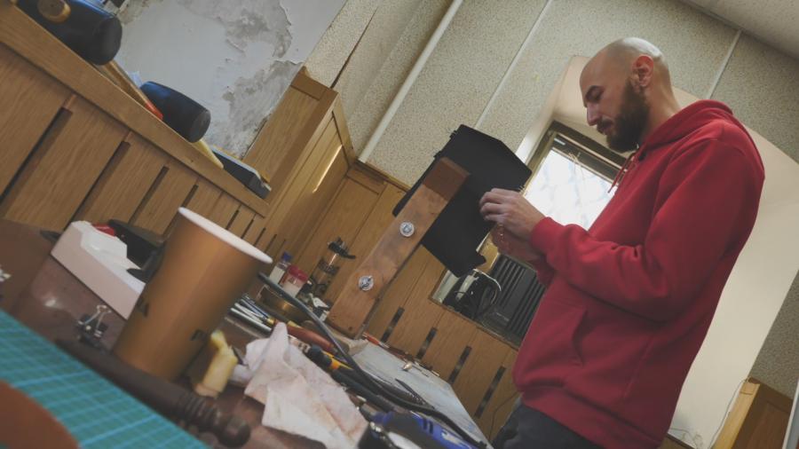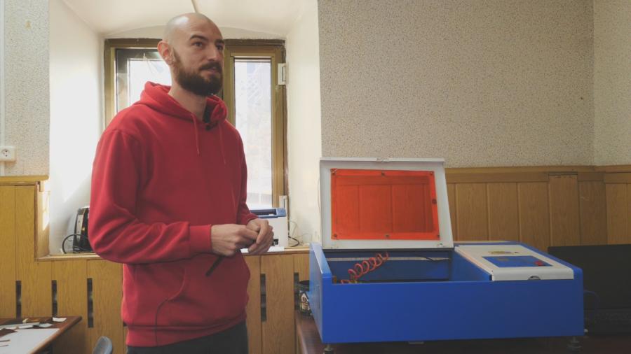 «Лазерний станок потрібен для того, щоб гравірувати на шкірі різні малюнки. На шорніку затискається шкіра та прошивається. Через те що я прошиваю вручну, одразу двома руками, мені потрібно, щоб вироб тримався», - Станіслав Пащенко, виготовляє вироби зі шкіри.