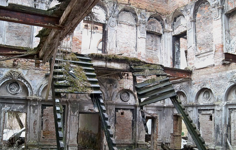 Плитка на підлозі, як припускають, може бути з фабрики Івана Левинського. Олена Замойська досліджує історію цієї памʼятки. Каже, що інтерʼєр почали руйнувати під час Першої світової війни. «Офіцери російської армії квартирували в цьому палаці, і на фотографіях ми бачили, як вони там пʼють горілку за столами в оточенні гарних предметів інтерʼєру. Але відомо, що палац дуже сильно пограбували, хоча після Першої світової війни він був у досить хорошому стані, він був збережений», ‒ розповідає краєзнавиця, учасниця табору Олена Замойська.